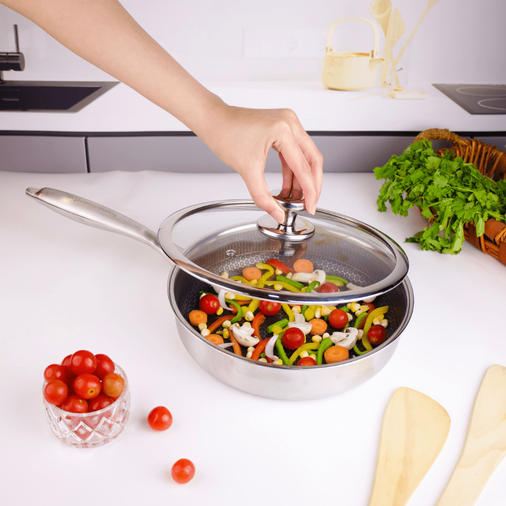 The 316 Stainless Steel Frying Pan is engineered for durability, even heat distribution, and a superior non-stick experience. Featuring a unique honeycomb texture, this multipurpose non stick honeycomb frying pan with lid minimizes food contact to prevent sticking, without the need for harmful coatings. The three-layer construction ensures fast heating, reducing oil smoke and hot spots for precise cooking.