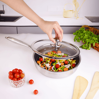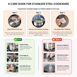 The multi-layered design, consisting of stainless steel, aluminum, and stainless steel, ensures quick and uniform heat distribution. This stainless steel cookware set with glass lid prevents uneven cooking, reduces oil smoke, and maintains consistent temperatures for better results in frying, sautéing, and searing.