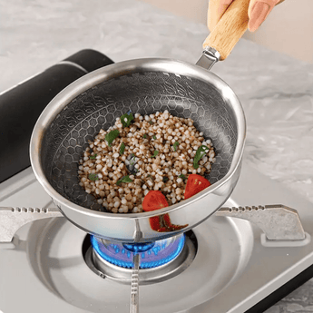 Make quick and delicious everyday meals with the Stainless Steel Nonstick Mini Frying Pan with Wooden Handle (13cm), perfect for frying eggs, toasting spices, sautéing vegetables, or preparing small portions for kids. This compact stainless steel frying pan offers smooth non-stick performance and fast heating, while the sturdy frying pan with wooden handle ensures safe, stylish handling. A must-have stainless steel mini frying pan for modern kitchens that love efficient, easy cooking with premium non stick cookware.
