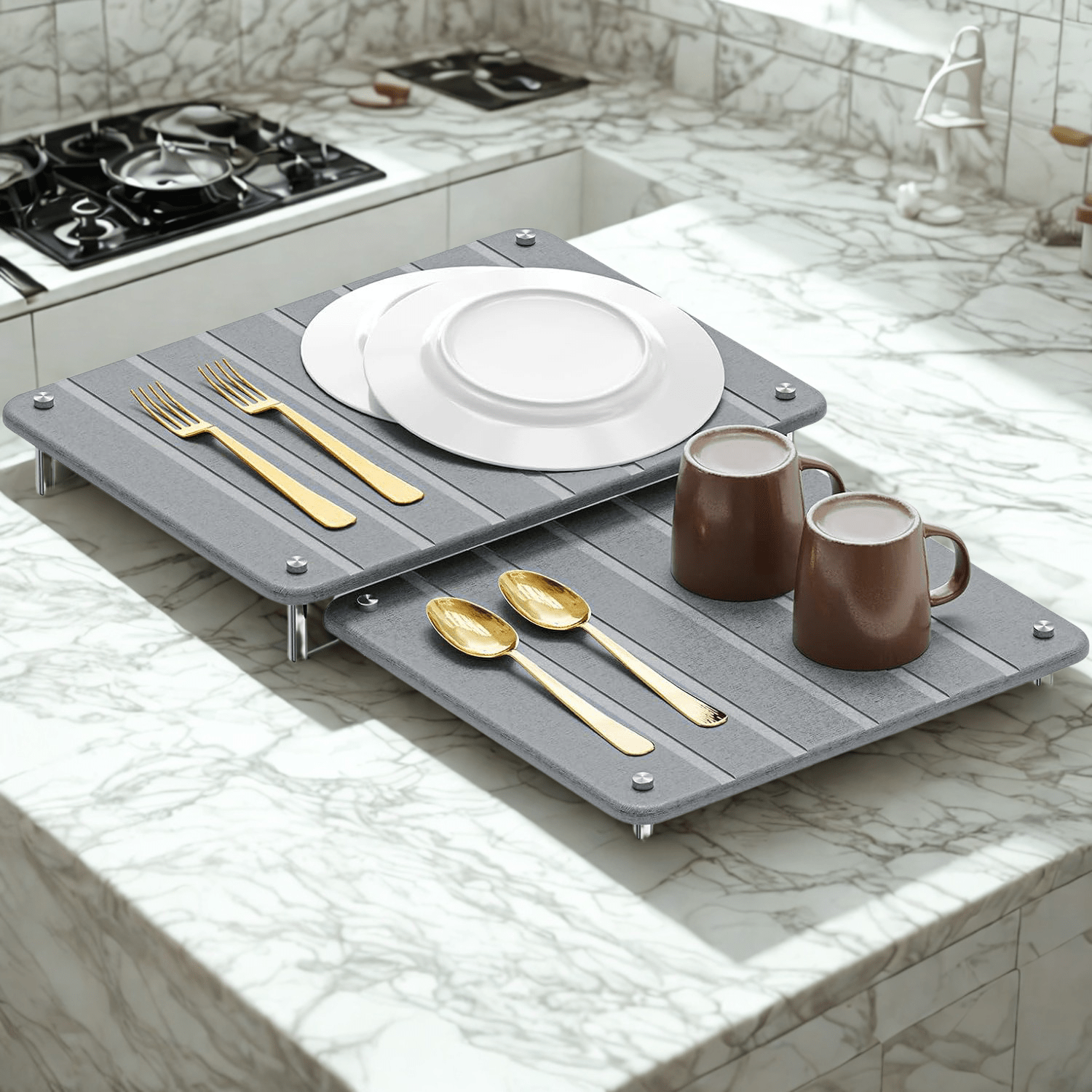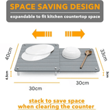 Keep your kitchen countertop neat, dry, and stylish with this 2-pack stone dish drying mat set. Designed for fast drying, these absorbent stone mats prevent water pooling while adding a modern, minimalist touch to any kitchen decor. The adjustable design allows you to place them side by side or expand them to fit different counter spaces, making them a versatile and space-saving solution for drying dishes, utensils, and more.