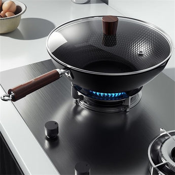 Traditional Uncoated Iron Wok with Wooden Handle & Glass Lid (30cm)